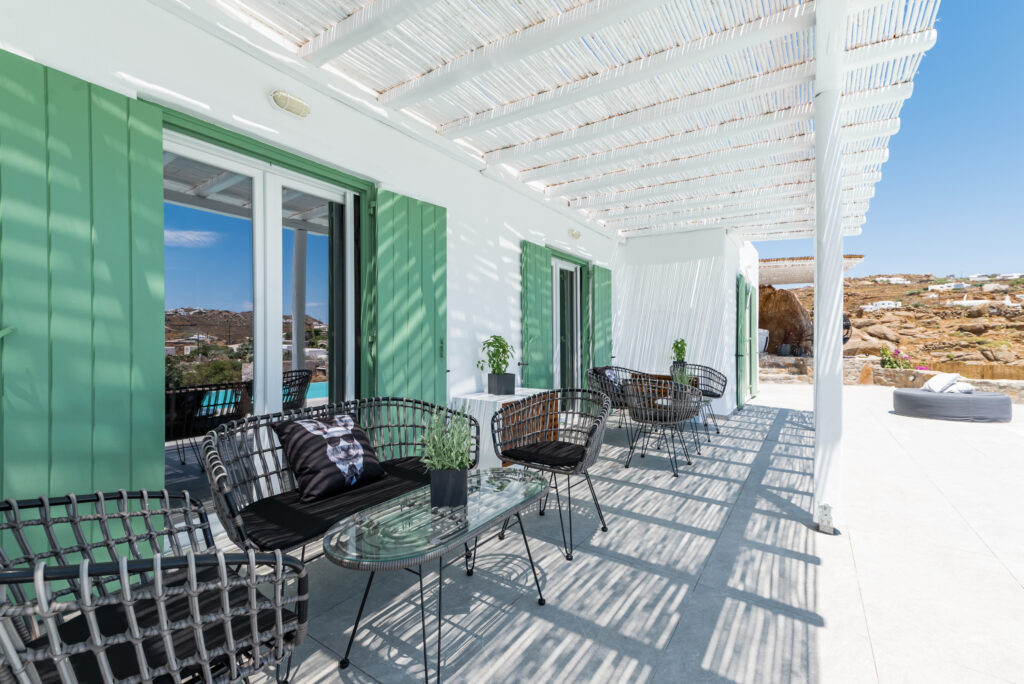 Very quiet, peaceful, large pool, sheltered jacuzzi and large outdoor areas. You can ask in the shade of the wind, no neighborhood nearby so absolute calm. Villa very clean and very well maintained. Nice sea view. 10 minutes drive from the city center of Mykonos.