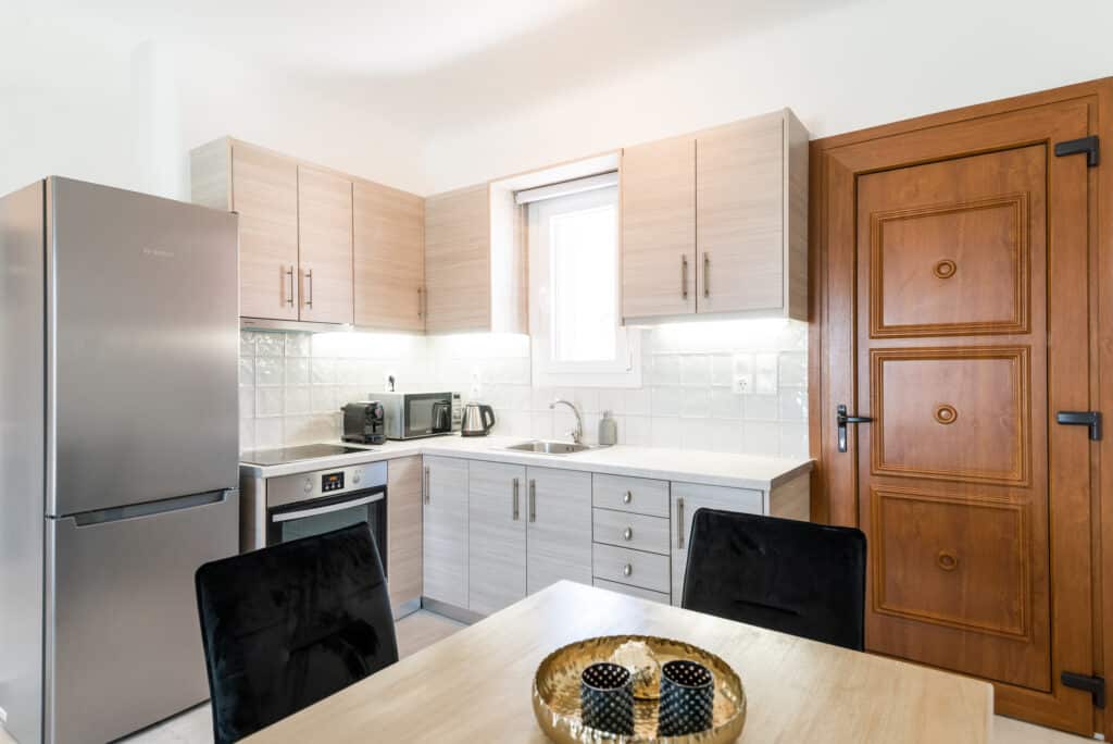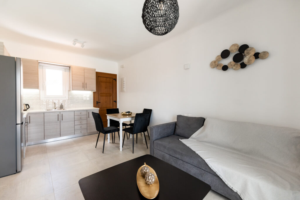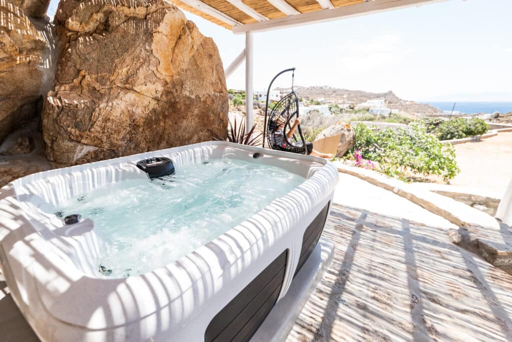 Enjoy the starry Cycladic sky, the refreshing warmth of the sun by the comfort sunbeds, and peaceful moments in the private pool and jacuzzi. The Villas consists of two separate houses 50sqm each house, 100sqmin total. Accommodation experience, two spacious living rooms with lounge area, two dining tables, two fully equipped open-plan kitchens, two double bedrooms with Queen-sized beds & two bathrooms with shower. Capacity is for 6 people.